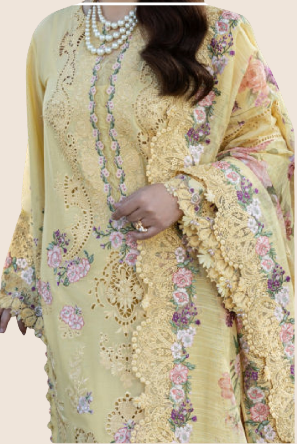 If you're looking to refresh your wardrobe with timeless elegance, Fashionz for You brings you a stunning embroidered lawn ensemble designed for effortless sophistication. This outfit features a beautifully embroidered lawn laserwork front panel that adds intricate detail and refined charm. The solid dyed lawn front side panels and back create a balanced, graceful silhouette perfect for any occasion.