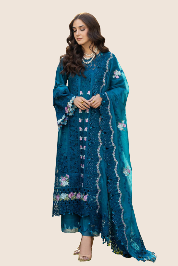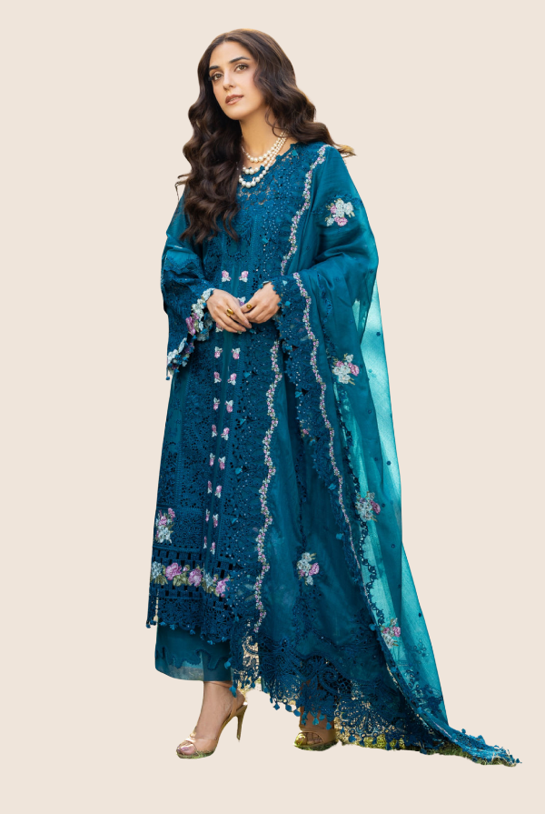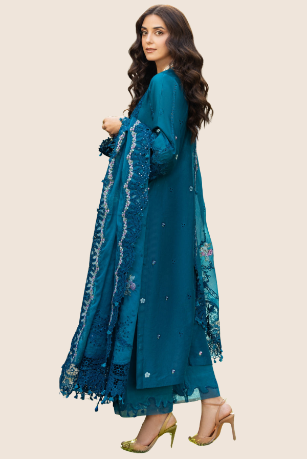 Delicate embroidered lawn laserwork sleeves enhance the overall look with subtle artistry. The outfit is further elevated with an embroidered organza front daman border, adding a luxurious finishing touch. An additional embroidered organza daman and sleeves border enhances the design with layered elegance.