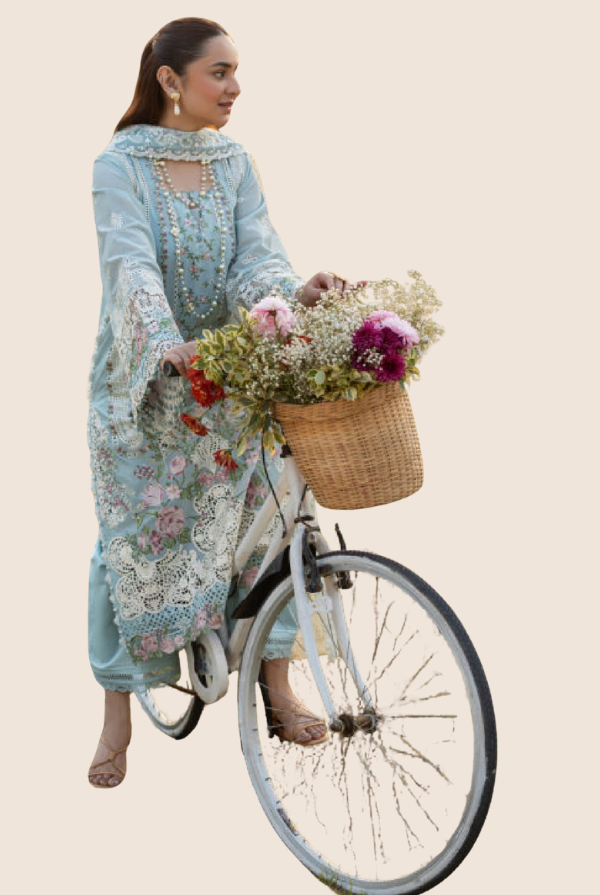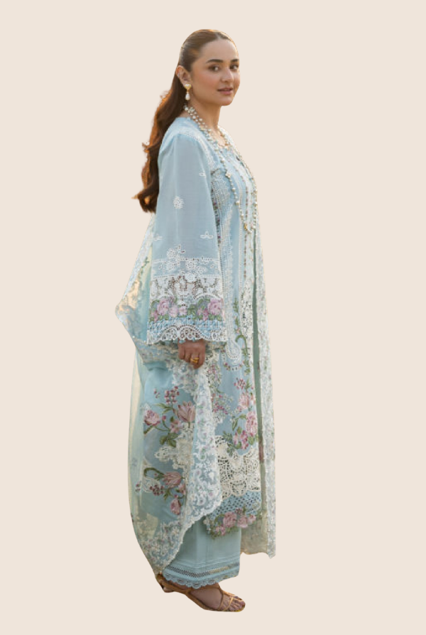Delicate embroidered lawn laserwork sleeves enhance the overall look with subtle artistry. The outfit is further elevated with an embroidered organza front daman border, adding a luxurious finishing touch. An additional embroidered organza daman and sleeves border enhances the design with layered elegance.